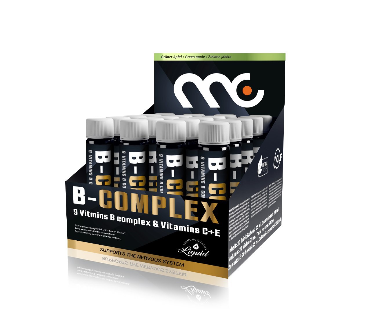 B-COMPLEX is a dietary supplement in the form of ampoules to be consumed directly or after dilution in water. Get to know the complex of B vitamins from Muscle Clinic. One package provides 20 flavored portions, providing nearly 3-week supplementation with B vitamins.