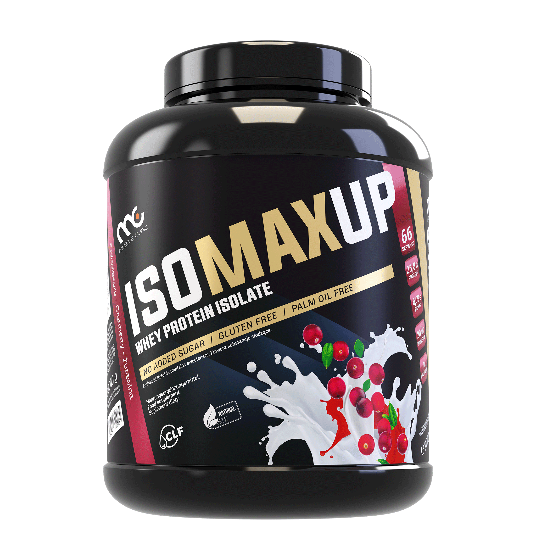 The composition of the Muscle Clinic IsoMaxUp product on the example of cranberry flavor: milk protein isolate ( milk ( lactose ), soy lecithin ), milk proteins ( milk ( lactose )), L-glutamine, aroma: cranberry, sweetener: sucralose, bromelain.