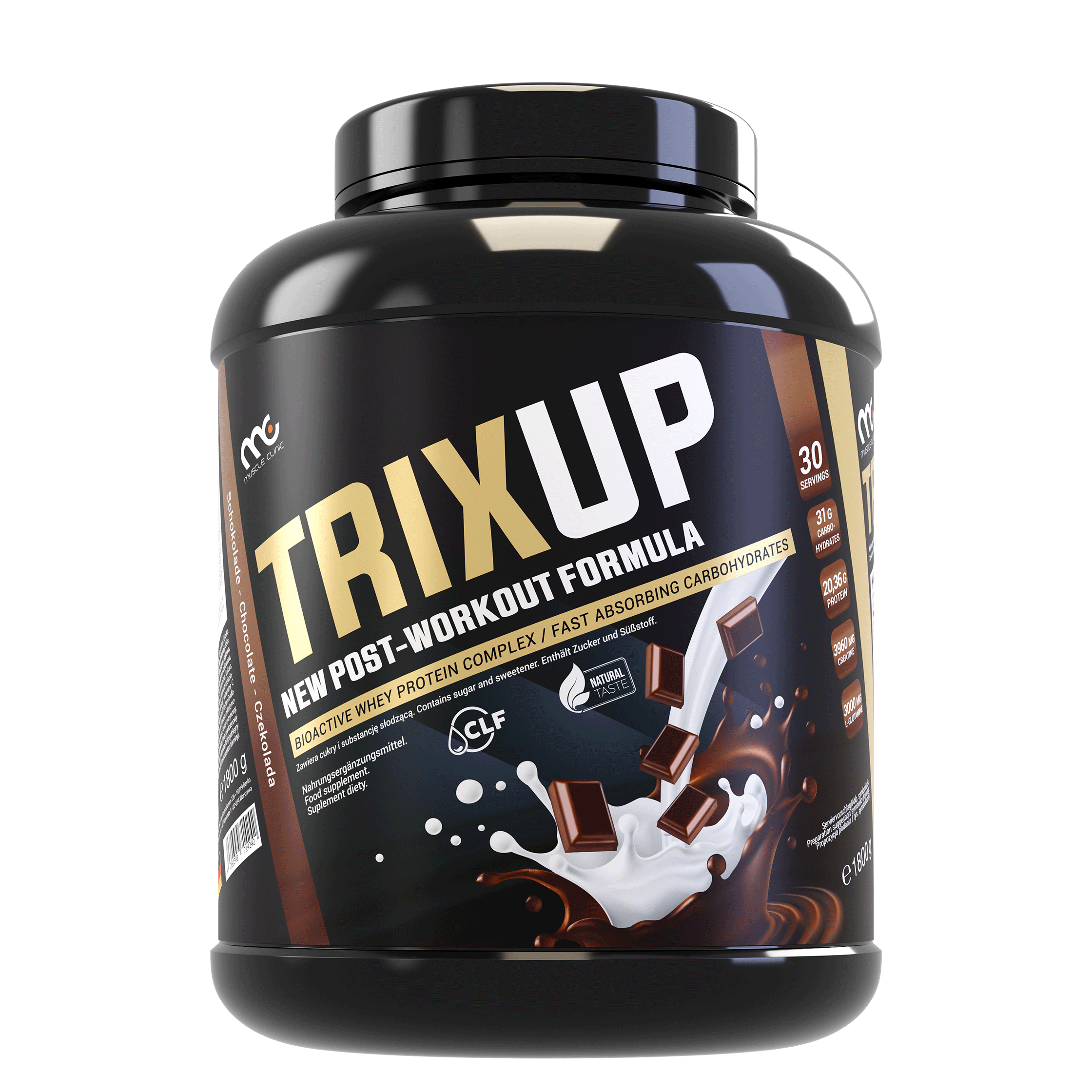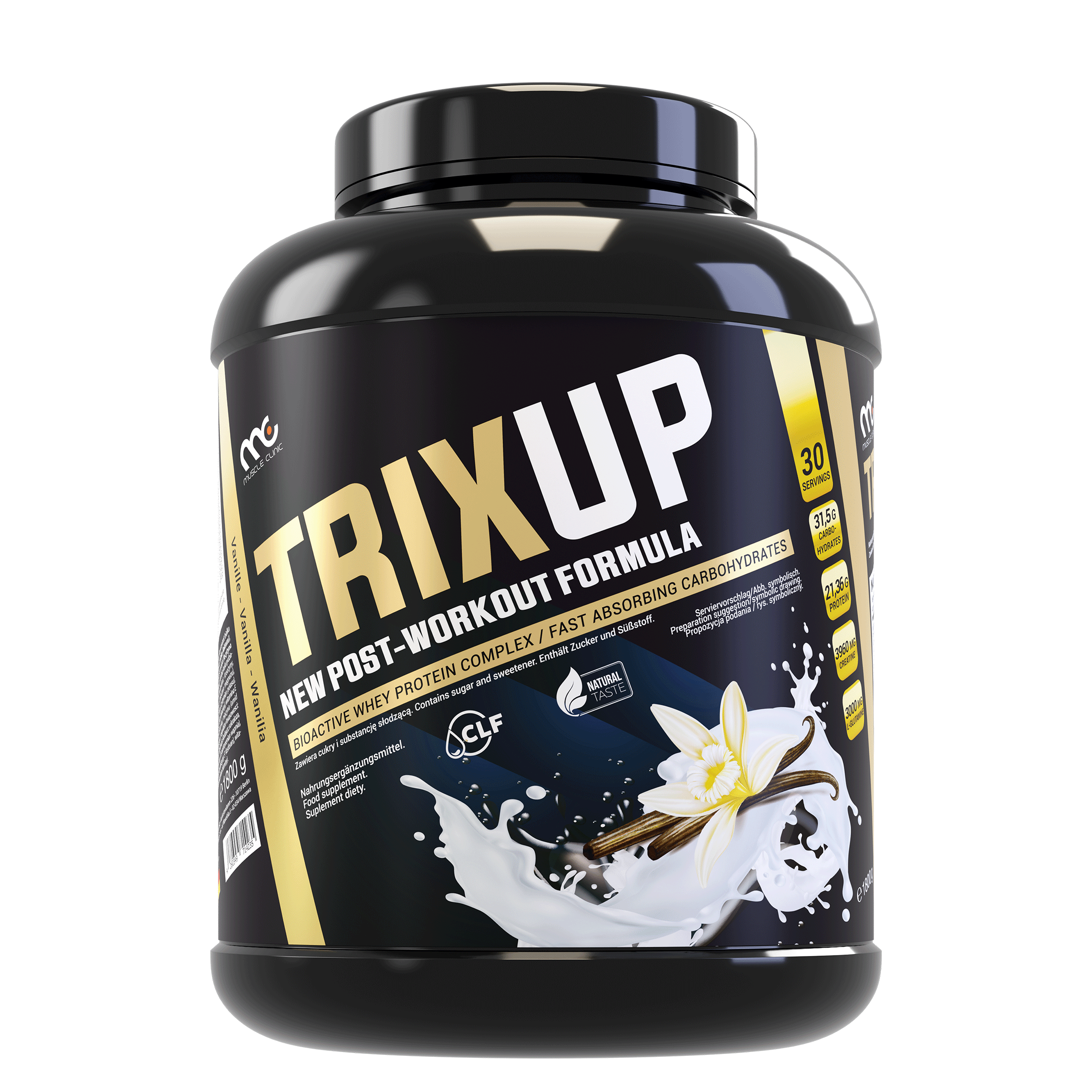 Muscle Clinic Trix Up is a modern post-workout formula consisting of a protein composition (whey protein concentrate and whey protein isolate – WPC + WPI), quickly assimilated carbohydrates of both low and high glycemic index (maltodextrin, dextrose, waxy corn starch), glutamine, creatine, vitamins (vitamin B1, B6, pantothenic acid, niacin, vitamin C, E) and minerals (potassium and magnesium).
